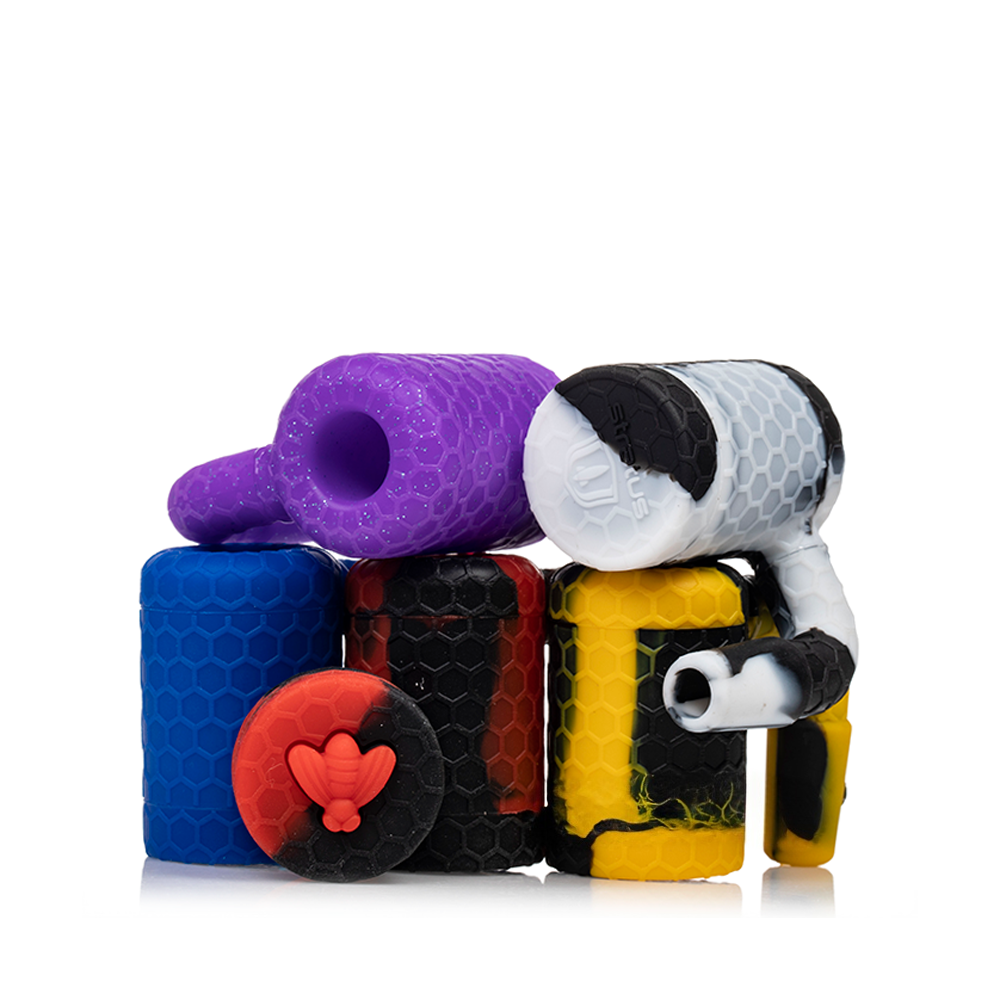 Discover the Stratus Bee Silicone Wax Reclaimer, featuring a silicone reclaimer, bottom lid for built-up concentrate extraction, and a silicone stash jar.
